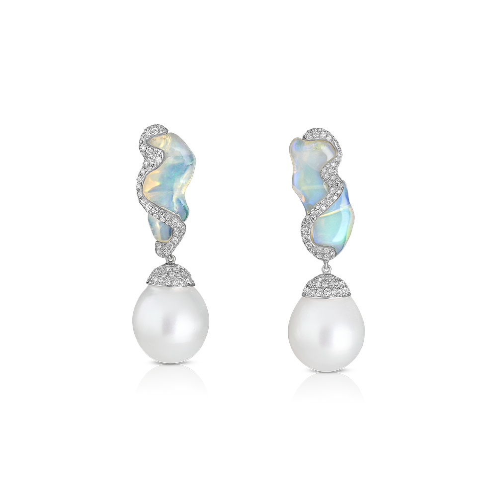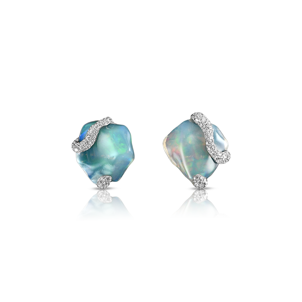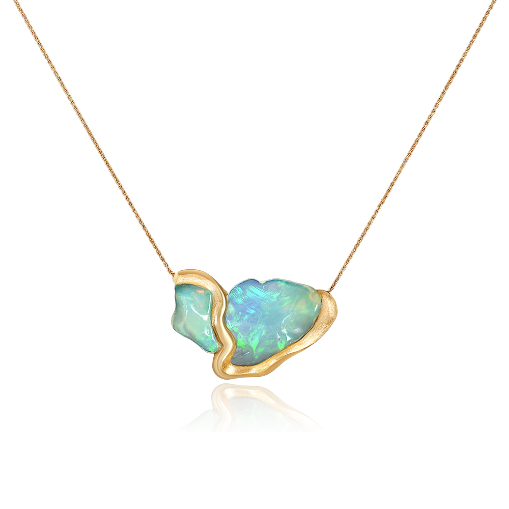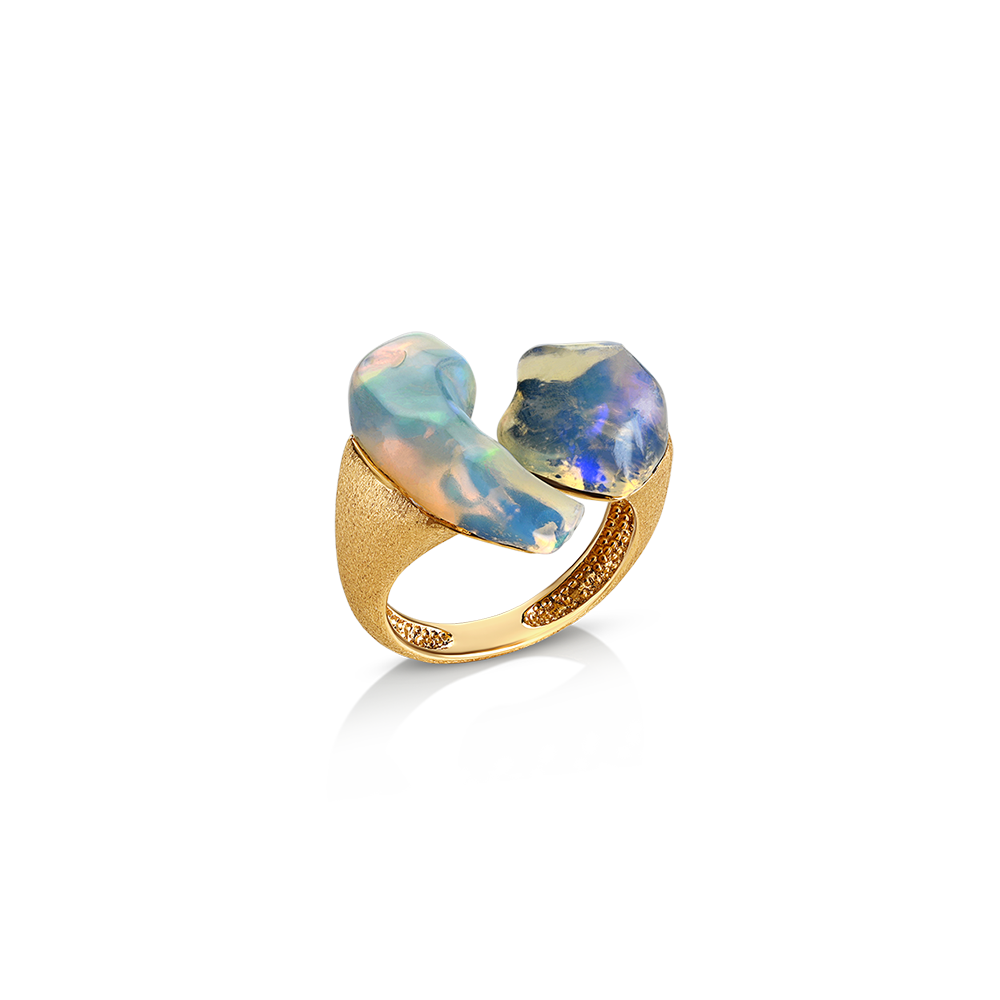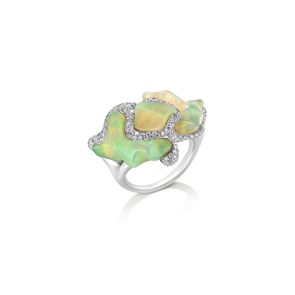 Each piece is crafted in 18K gold and illuminated by natural diamonds, designed to honor the opal’s mysterious radiance and organic form. From ice blue to vivid green, no two stones are ever alike , each one echoing a story entirely its own.