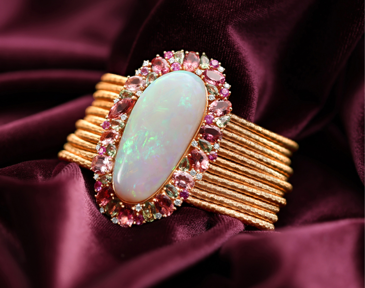 An Ethiopian opal takes center stage in this striking bracelet, framed by vibrant sapphires, diamonds, and tourmalines. Set in romantic pink gold, the piece enhances the harmony of colors, creating a luminous, elegant design.