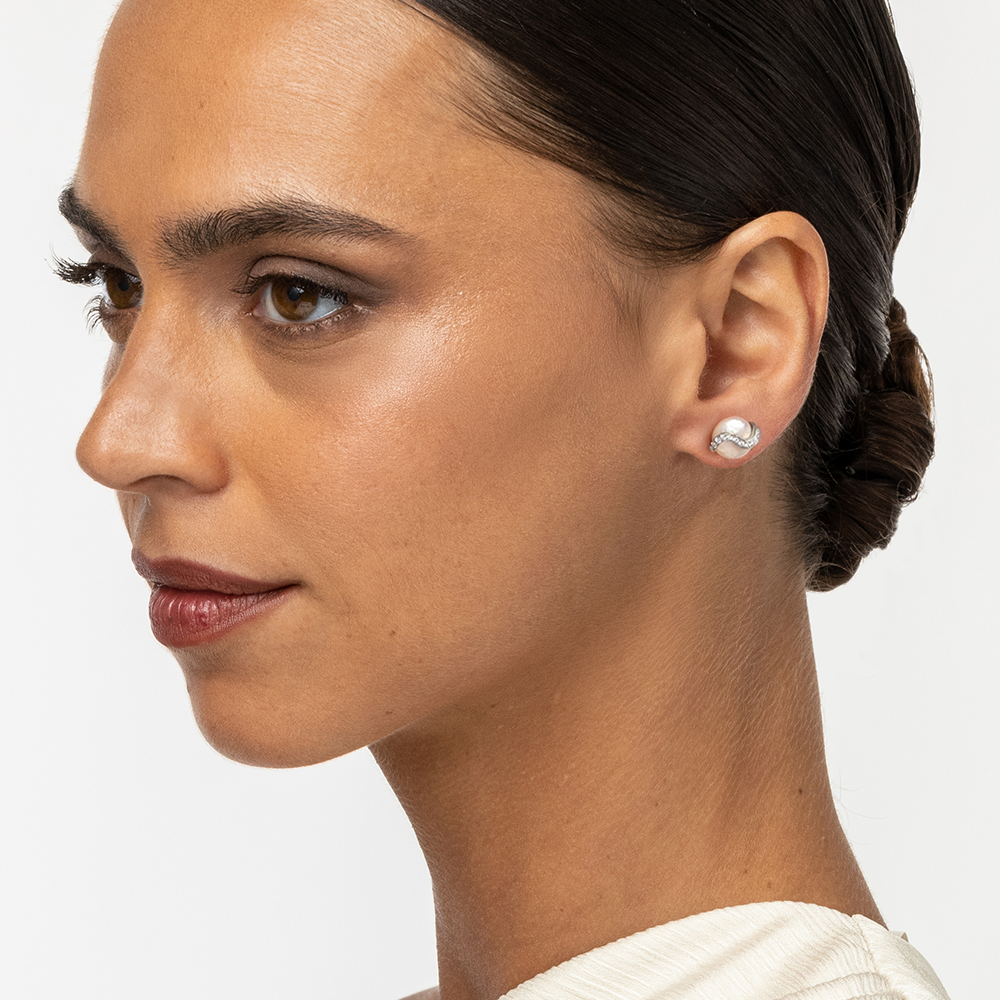 These exquisite 18K white gold earrings from the Biwa Collection exude timeless elegance, each adorned with a 10 mm round flat coin pearl. The pearls’ surface ripples with an organic texture, reminiscent of calm sea waves. A wave of 0.17 ct. diamonds graces each pearl, adding a captivating sparkle that enhances the natural luster of the pearls. The pearls’ flattened form and the necklace’s unique diamond design pay homage to Lake Biwa’s revered coin pearls.