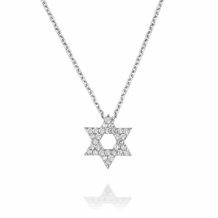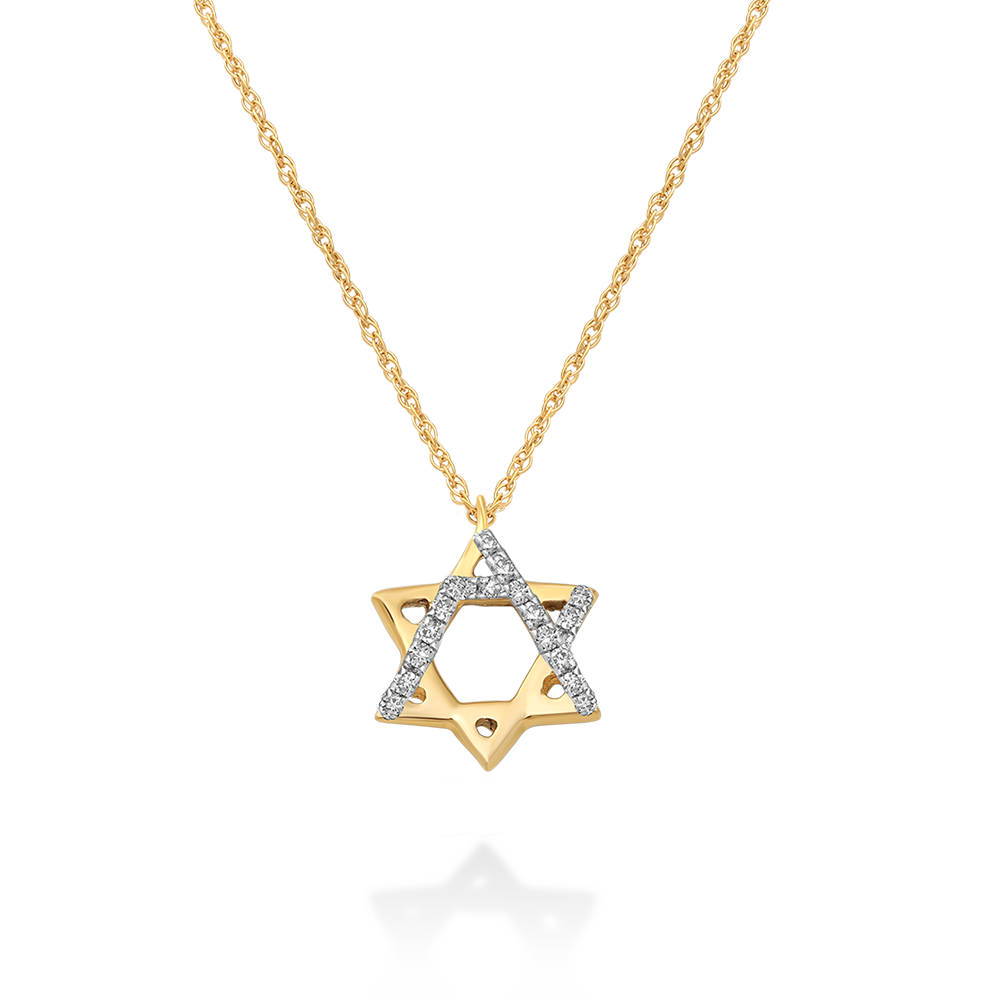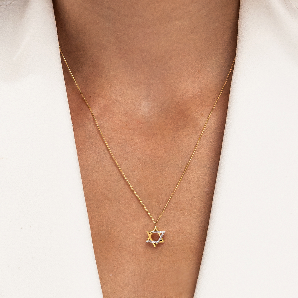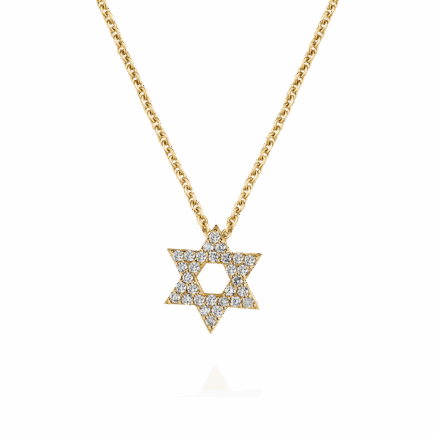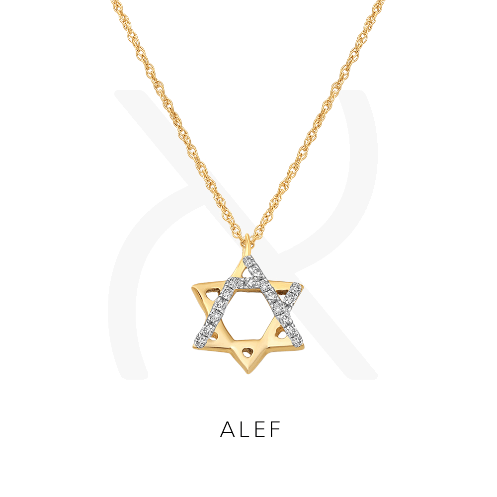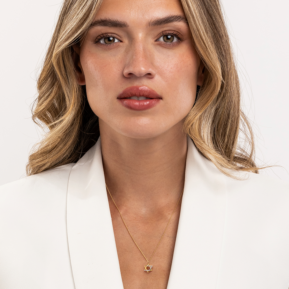 The Magen David, “Shield of David”, is a sacred symbol of protection, rooted in tradition. According to jewish tradition, this emblem adorned King David’s shield, guarding him in battle. Mystically, its interlocking triangles incorporates all 22 Hebrew letters. This necklace brings that legacy to life, featuring your chosen Hebrew initial in pavé-set diamonds, handcrafted in Jerusalem in luminous 18K gold. A timeless symbol of strength, faith, and Jewish identity.