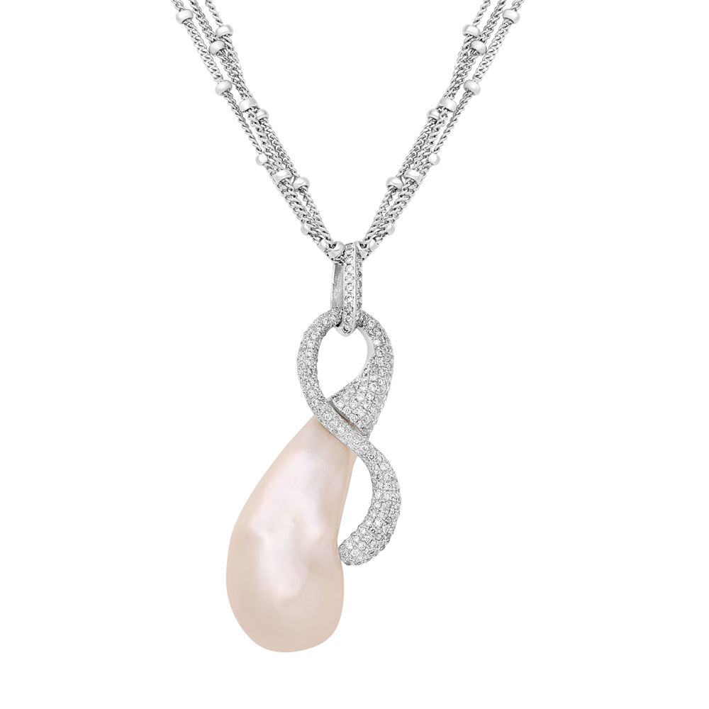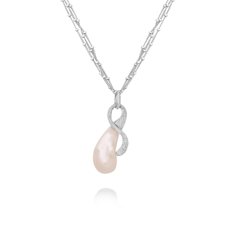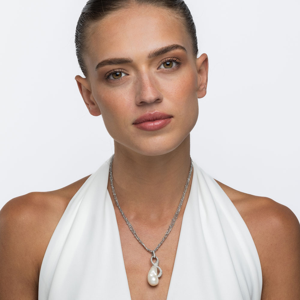 The Black & White Collection’s Baroque Pearl Infinity Pendant is a testament to the seamless interweaving of form and elegance. A 15 by 31 mm natural baroque pearl, chosen for its unique shape and warm luster, is the centerpiece of this exquisite necklace. Encircling the pearl, the infinity-shaped pendant sparkles with 1.46 ct of natural white diamonds, meticulously set in polished 18K white gold. This design captures the collection’s celebration of nature’s effortless beauty, rendered through refined craftsmanship.