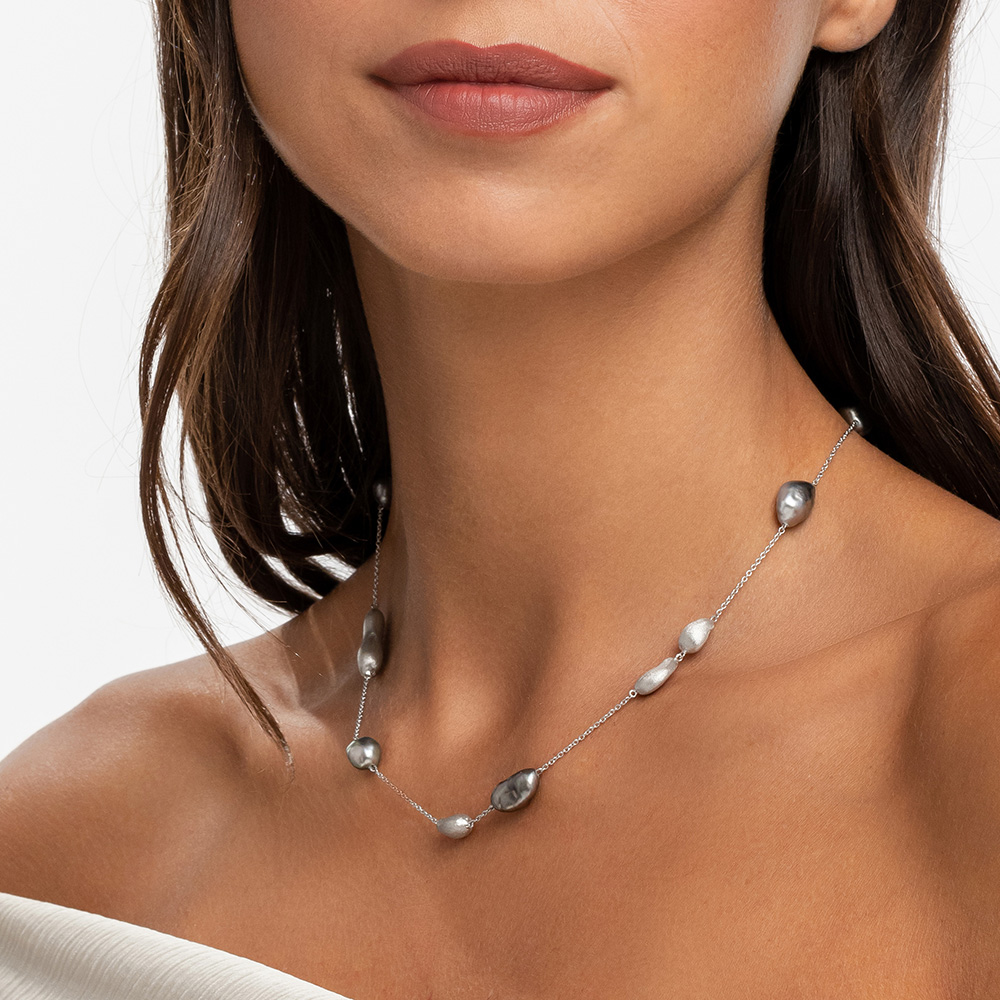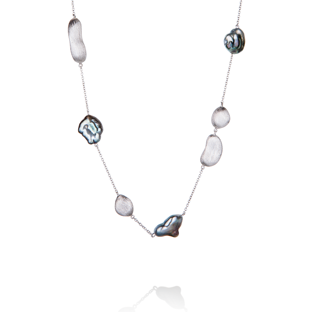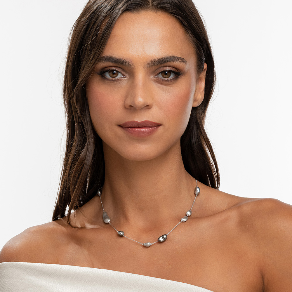 From the captivating Tahiti collection comes this 18K satin finish white gold necklace, adorned with natural black Tahitian keshi pearls. Each pearl, unique in its shape, echoes the mystical shades of the ocean, suspended along the delicate chain like drops of the sea transformed into rare treasures.