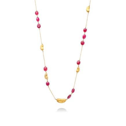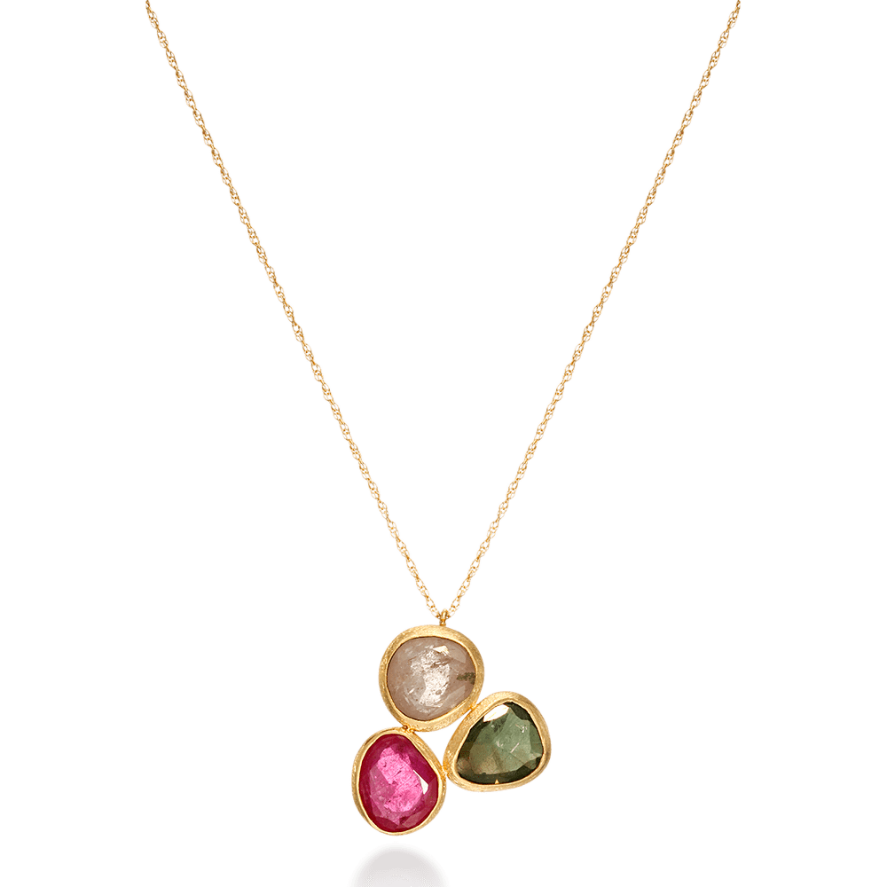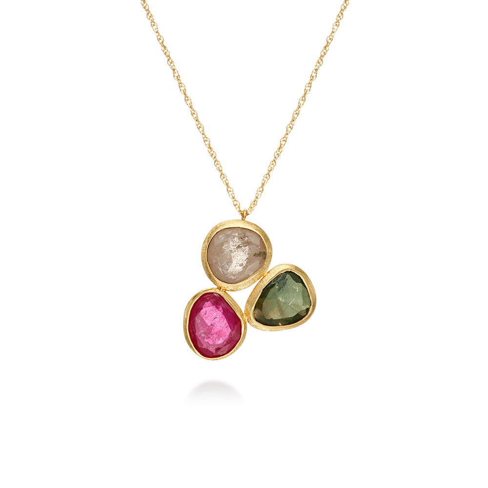 Channeling the essence of Africa’s Umba River Valley, this 18K yellow gold necklace from the Rainbow Collection is a symphony of natural sapphire hues. The medley of a 4.60 ct. multicolor sapphires in pink, green, and earthy tones reflects the diversity of Tanzania’s landscape, set in a cascade of gold that glimmers with a sunset warmth.